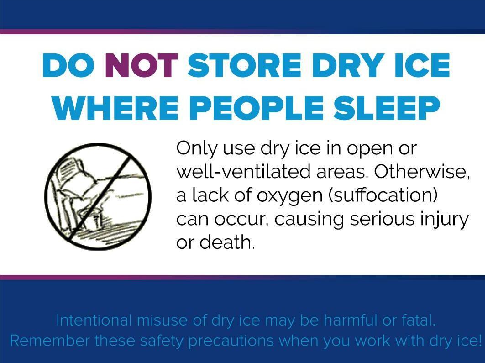 - ALWAYS – Store dry ice in well ventilated areas, out of direct sunlight and sources of heat.